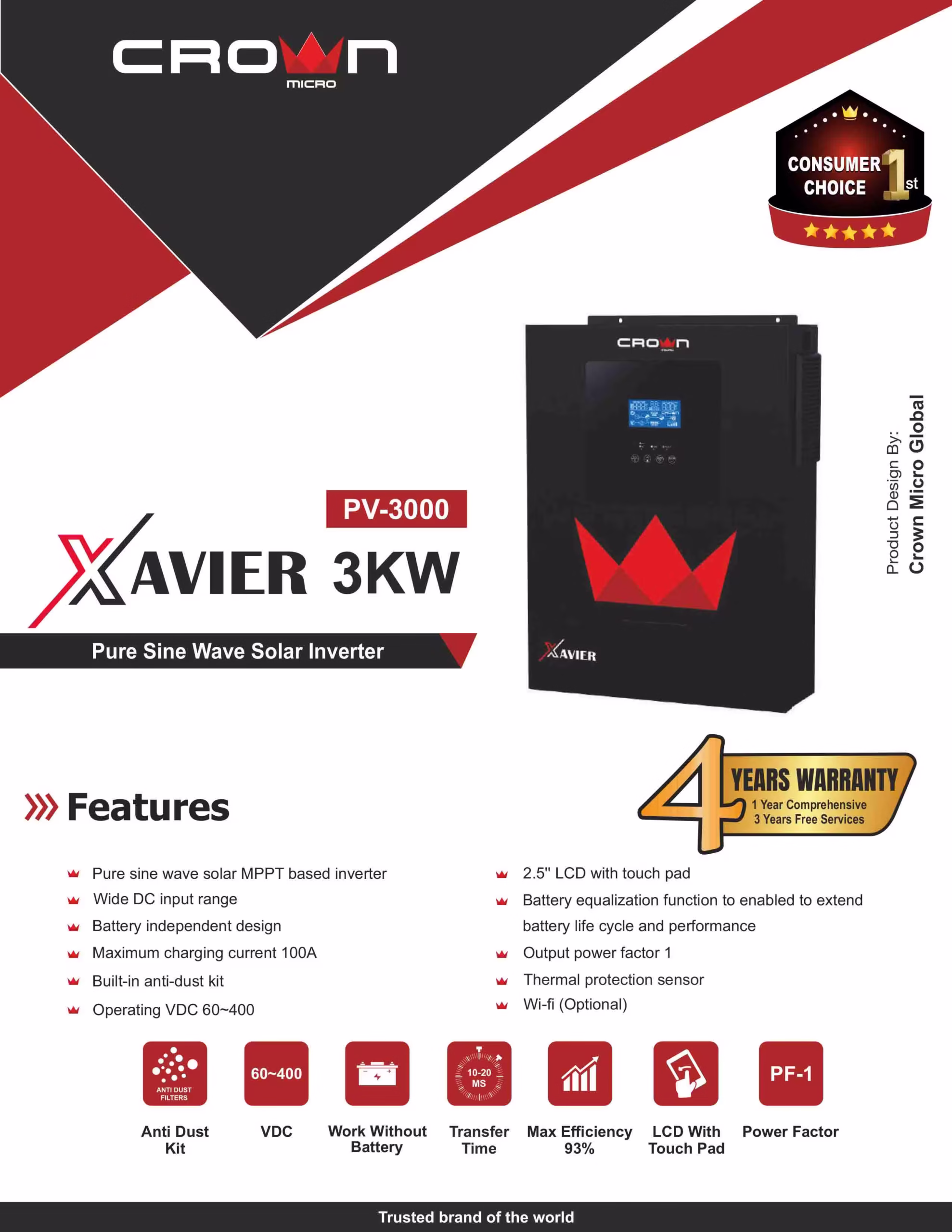 The Crown 3Kw Xavier PFI 3.6kw is designed for dependable solar power conversion and energy storage. It features robust protection mechanisms, efficient MPPT tracking, and compact design for easy installation. Suitable for a variety of residential and small commercial systems, this unit balances performance and reliability.
